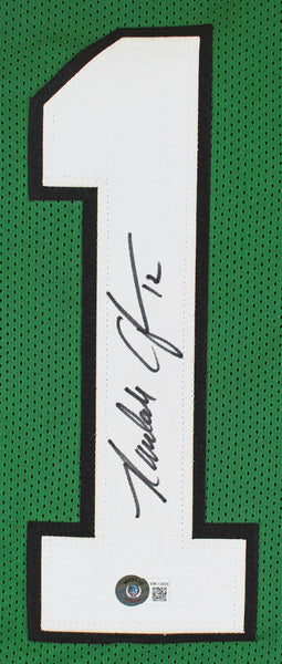 This Autographed Green Pro Style Jersey has been Personally Signed by Randall Cunningham of the Philadelphia Eagles. This item is 100% Authentic to include a Certificate of Authenticity (COA) / hologram by Beckett Authentication Services. This item is 100% Authentic to include a hologram by Beckett Authentication Services. This item may come with the new Beckett Authentication hologram that has a scannable QR code rather than the traditional COA. If you would like to have a COA, you are welcome to reach out to Beckett for a printed certification once you receive your item. This is a BAS Witnessed Protection Program item which means a Beckett Authentication Service representative was present when this item was being signed. This is a stock item. We conducted an autograph signing with Randall Cunningham and we have several of these available. The one you will receive will be of equal quality to the one pictured. This item can be verified through BAS Witnessed. This is a X-Large sized, non-branded, custom-stitched Jersey.