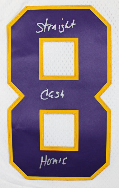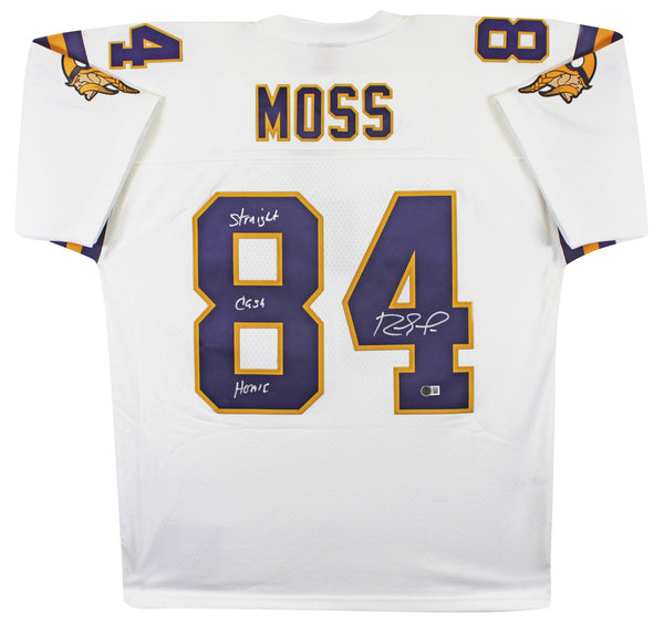 This Autographed White Mitchell & Ness Jersey with the inscription of "Straight Cash Homie" has been Personally Signed by Randy Moss of the Minnesota Vikings. This item is 100% Authentic to include a hologram by Beckett Authentication Services. This item may come with the new Beckett Authentication hologram that has a scannable QR code rather than the traditional COA. If you would like to have a COA, you are welcome to reach out to Beckett for a printed certification once you receive your item. This is a BAS Witnessed Protection Program item which means a Beckett Authentication Service representative was present when this item was being signed. We conducted an autograph signing with Randy Moss where multiples of the same item were signed. While the photographs are representative of this item, the size, placement and strength of the signature may vary. Each item is hand signed, therefore, each autograph is unique. This item can be verified through BAS Witnessed. This is a X-Large sized Jersey.