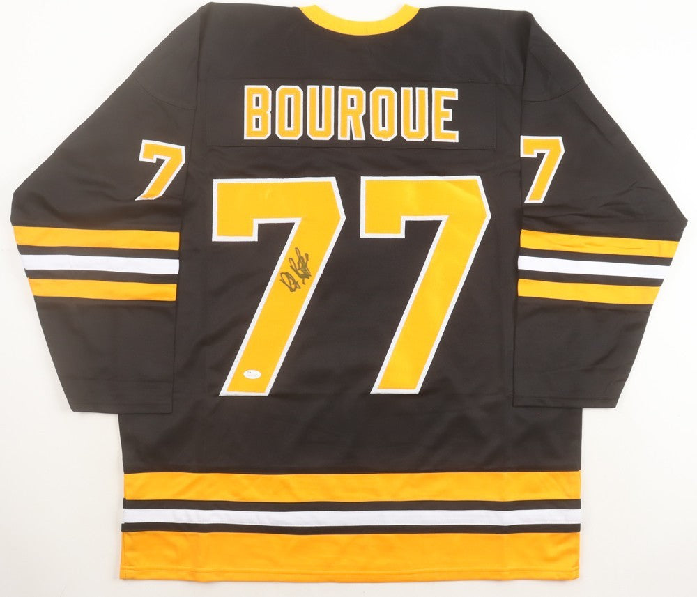Custom on-ice style jersey. Everything sewn on, size XL. Hand-signed and Inscribed in silver paint pen by Ray Bourque (HOF). The autograph includes an official James Spence Authentication (JSA) hologram and matching COA for authenticity purposes. The signing of this item was witnessed by JSA.Authentication: JSA COA