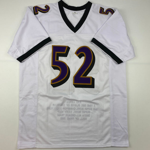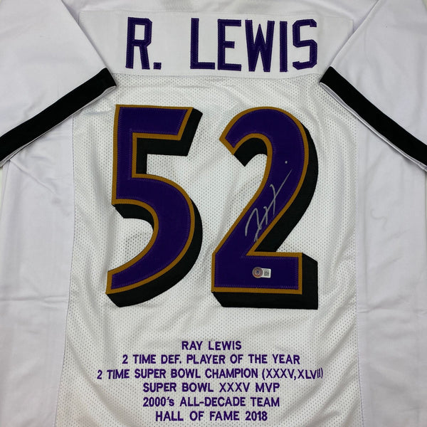 Autographed/Signed Ray Lewis Baltimore White Stat Football Jersey Beckett COA Jersey has no brand names or logos. This is a custom jersey and was not manufactured by or in any manner associated with any professional sports league or manufacturer. This custom jersey carries no professional sports league designation. The item is intended to be an autographed collectible. The custom jersey displays the name and number of the player. This item in no way is affiliated with or connected to any professional sports organization. Size is XL.