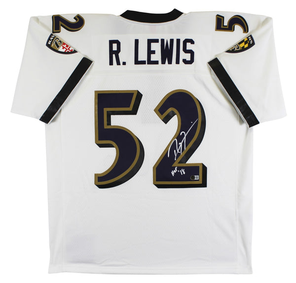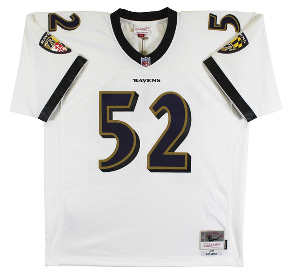 This Autographed White Mitchell & Ness Jersey has been Personally Signed by Ray Lewis of the Baltimore Ravens. This item is 100% Authentic to include a hologram by Beckett Authentication Services. This item will come with an affixed Beckett Authentication Services (BAS) authentication sticker, which includes a scannable QR code to verify authenticity. Please note that Beckett no longer provides serial-numbered COA cards, and the attached BAS sticker will serve as the complete authentication for this item. This is a BAS Witnessed Protection Program item which means a Beckett Authentication Service representative was present when this item was being signed. We conducted an autograph signing with Ray Lewis where multiples of the same item were signed. While the photographs are representative of this item, the size, placement and strength of the signature may vary. Each item is hand signed, therefore, each autograph is unique. This item can be verified through BAS Witnessed. This is a X-Large sized Jersey.