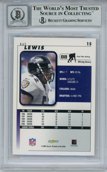Ray Lewis Autographed 2001 Score #15 Trading Card Beckett 10 Slab 35226 The number in the listing title is just an inventory sku for our records and is not the authentication number. The item pictured is a stock photo unless otherwise noted. This is a 2001 Score #15 trading card that was personally autographed by Ray Lewis. This has been professionally slabbed by Beckett Authentication Services (BAS) and includes a certificate of authenticity from Denver Autographs.