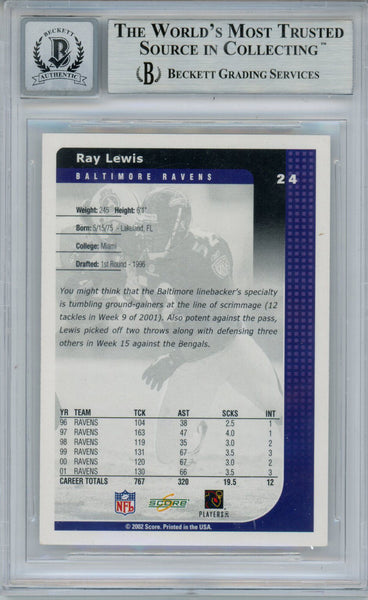 Ray Lewis Autographed 2002 Score #24 Trading Card Beckett 10 Slab 35227 The number in the listing title is just an inventory sku for our records and is not the authentication number. The item pictured is a stock photo unless otherwise noted. This is a 2002 Score #24 trading card that was personally autographed by Ray Lewis. This has been professionally slabbed by Beckett Authentication Services (BAS) and includes a certificate of authenticity from Denver Autographs.