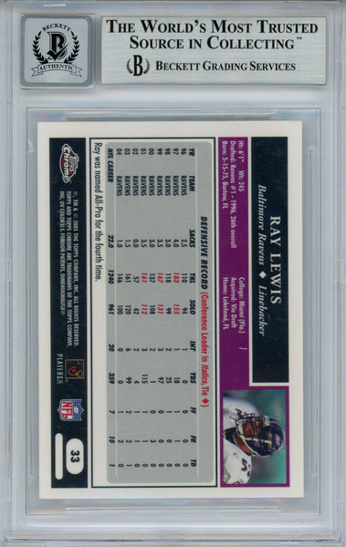 Ray Lewis Autographed 2005 Topps Chrome #33 Trading Card Beckett 10 Slab 35231 The number in the listing title is just an inventory sku for our records and is not the authentication number. The item pictured is a stock photo unless otherwise noted. This is a 2005 Topps Chrome #33 trading card that was personally autographed by Ray Lewis. This has been professionally slabbed by Beckett Authentication Services (BAS) and includes a certificate of authenticity from Denver Autographs.