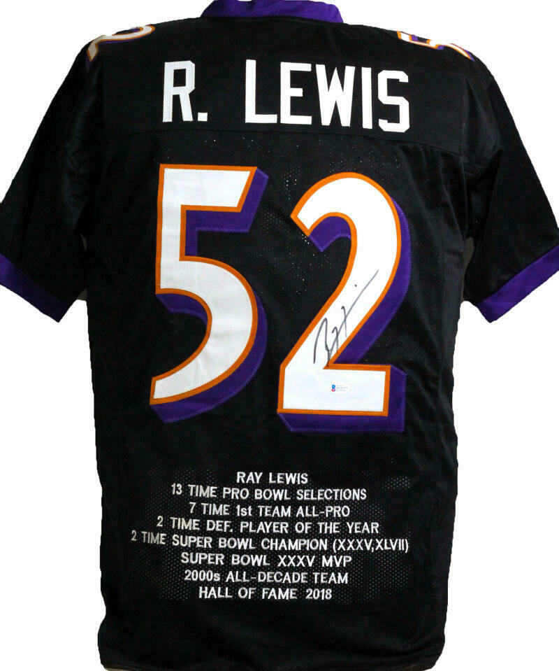 Ray Lewis Autographed Black Pro Style STAT2 Jersey - Beckett W Auth *2 THIS IS NOT AN NFL JERSEY. THIS HAS NO TAGS, NO LOGOS, NO EMBLEMS. This is a hand autograph of Ray Lewis on a Custom Made (non name brand) Authentic Style Jersey with stitched letters and numbers. This item has a Beckett Witnessed Authentication, which comes with a numbered and a matching Beckett Certificate of Authenticity. You can view this item on the Beckett Authentication website. It was signed either at a public autograph appearance or a private signing. This is a stock photo of the item. Although you may not receive this exact item, the item you receive is virtually identical and brand new in great shape. Jersey size is XL.