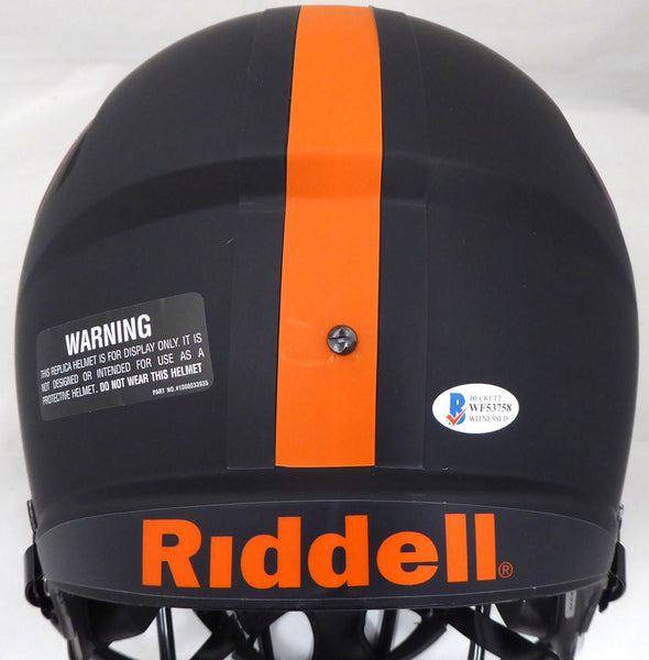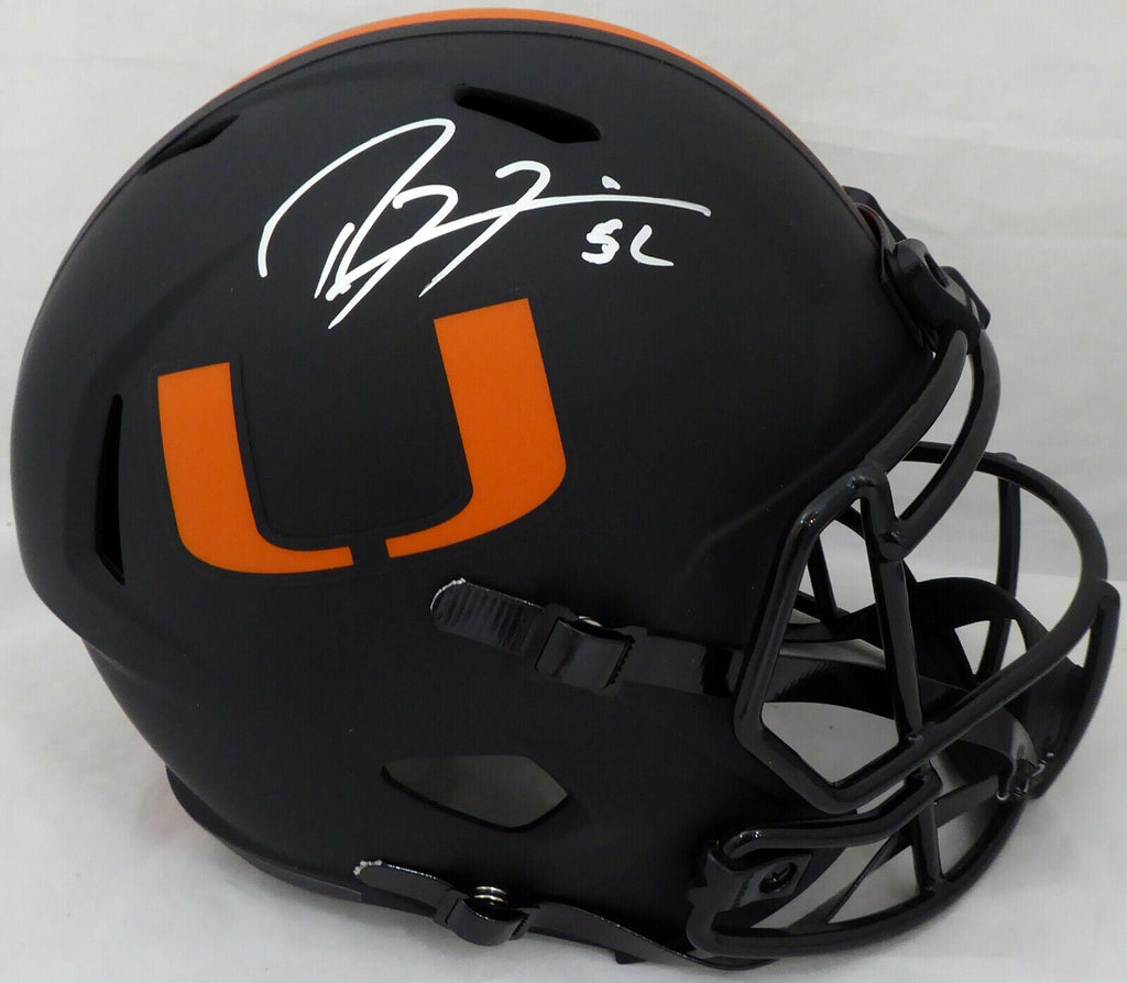 This is an Eclipse Black Miami Hurricanes Full Size Speed Replica Helmet that has been hand signed by Ray Lewis. This item has been certified authentic by Beckett Authentication (BAS) and comes with their serial numbered sticker and matching certificate of authenticity. NOTE: The Eclipse Black helmets are very delicate and often have some marks or scratches on them.