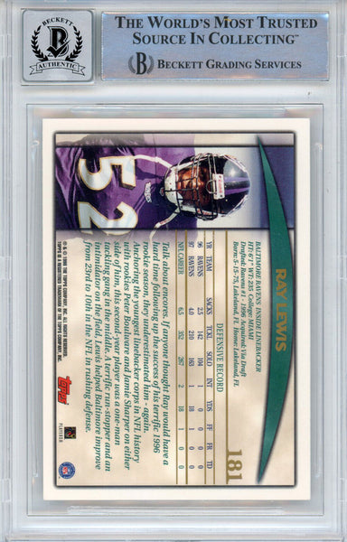 Ray Lewis Autographed/Signed 1998 Topps #181 Trading Card Beckett Slab 39216 The number in the listing title is just an inventory sku for our records and is not the authentication number. This is the exact item that you will receive so please see scans for condition. This is a trading card that was personally autographed by Ray Lewis. This has been professionally slabbed by Beckett Authentication Services (BAS) and includes a certificate of authenticity from Denver Autographs.
