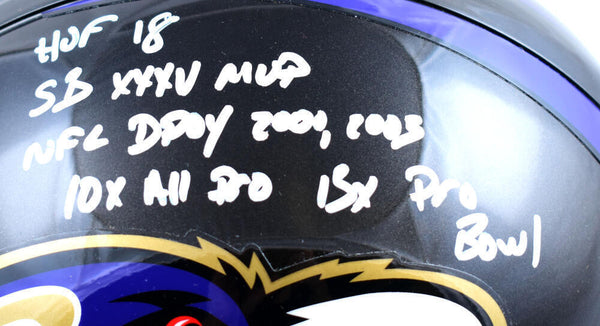 Ray Lewis Autographed Baltimore Ravens F/S ProLine Helmet w/ 5 Insc- Beckett Auth *White Full Name This is a Hand Autograph of Ray Lewis (Full Name) of the Baltimore Ravens on a Riddell Football Full Size ProLine Authentic Helmet and inscribed with HOF 18, SB XXXV MVP, NFL DPOY 2000 & 2003, 10X All Pro, and 15 x Pro Bowl . This item has a Beckett Witness Authentication, which comes with a Beckett numbered sticker and a matching certificate of authenticity. You can view this item on the Beckett Authentication website and it shows when and where the item was signed. It was signed either at a public autograph appearance or a private signing. This is a stock photo of the item. Although you may not receive this exact item, the item you receive is virtually identical and brand new in great shape.