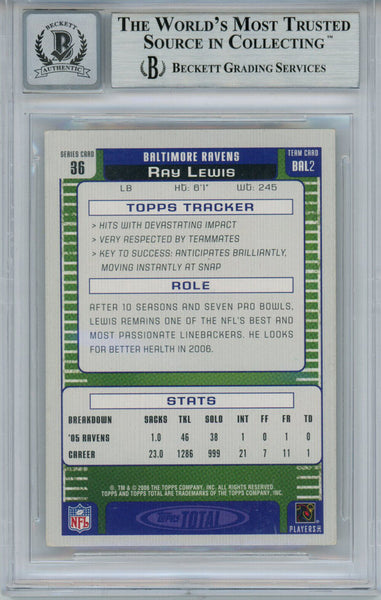 Ray Lewis Signed 2006 Topps Total Gold #36 Trading Card Beckett 10 Slab 35249 The number in the listing title is just an inventory sku for our records and is not the authentication number. The item pictured is a stock photo unless otherwise noted. This is a trading card that was personally autographed by Ray Lewis. This has been professionally slabbed by Beckett Authentication Services (BAS) and includes a certificate of authenticity from Denver Autographs.