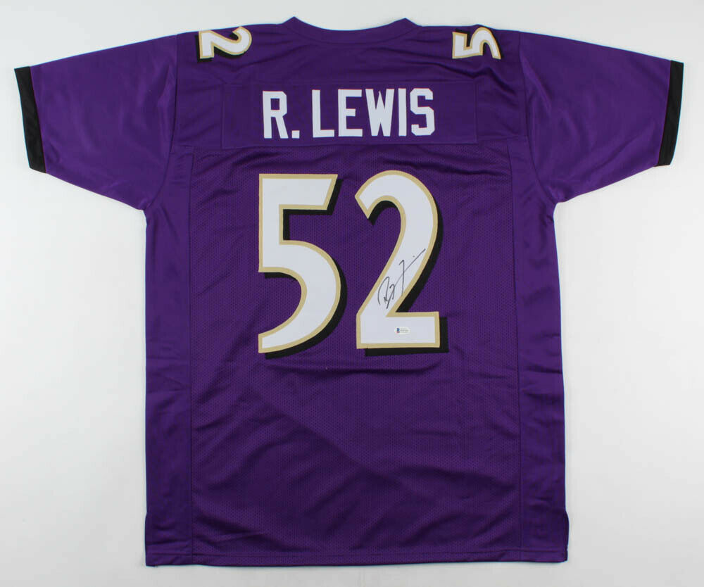 Custom on-field style jersey. Everything is sewn on, size XL. Hand-signed by Ray Lewis (HOF).The lot / autograph(s) includes an official Beckett Authentication Services serially-numbered hologram and matching COA for authenticity purposes. The signing of this item was witnessed by Beckett.Authentication: Beckett COA Check out all the items in our Friendly Confines Collectibles store, Thanks for looking.