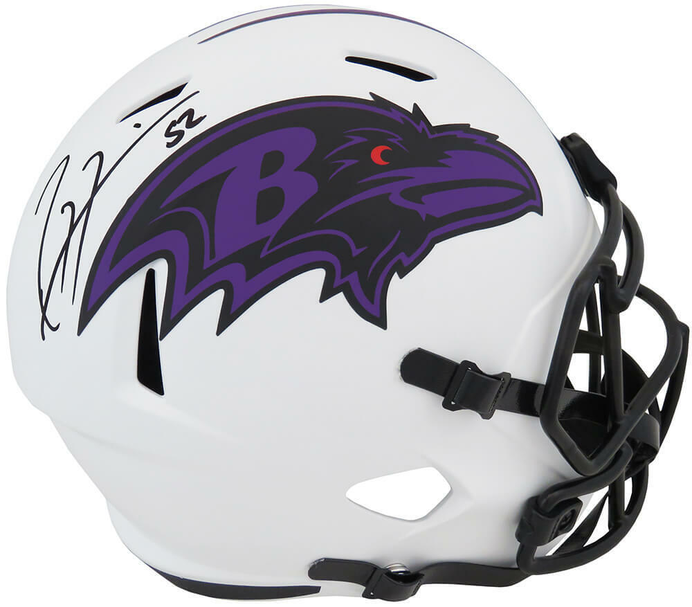 Ray Lewis signed Baltimore Ravens Lunar Eclipse white matte Riddell full size speed replica helmet. Item comes with a Schwartz Sports Memorabilia tamper-proof numbered hologram and Certificate of Authenticity which can be verified online.