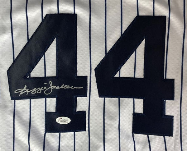 Featured is a Reggie Jackson signed New York Yankees Majestic replica baseball jersey. This jersey has been hand signed by Jackson and comes with the JSA hologram and certificate of authenticity. This jersey is size 2XL. This jersey would make a great addition to any sports memorabilia collection!. SPECIFICATIONS Autographed By: Reggie Jackson Team: New York Yankees Sport: Baseball Authentication: James Spence Authentication (JSA)