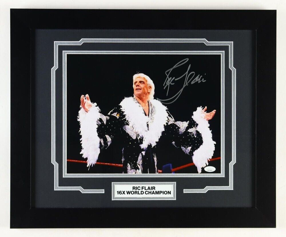 Custom frame measures approximately 19" x 23" in size and features a photo that has been hand-signed by Ric Flair (HOF).The lot / autograph(s) includes an official James Spence Authentication (JSA) hologram and matching COA for authenticity purposes. The signing of this item was witnessed by JSA.Authentication: JSA COA