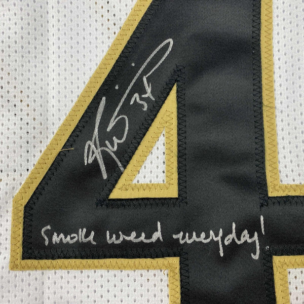 Autographed/Signed Ricky Williams Smoke Weed Insc New Orleans Jersey JSA COA Jersey has no brand names or logos. This is a custom jersey and was not manufactured by or in any manner associated with any professional sports league or manufacturer. This custom jersey carries no professional sports league designation. The item is intended to be an autographed collectible. The custom jersey displays the name and number of the player. This item in no way is affiliated with or connected to any professional sports organization. Size is XL.