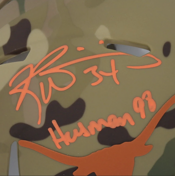 This texas longhorns camo mini helmet has been personally hand-signed by ricky williams with the inscription "heisman 98." it is officially licensed by the ncaa and comes with an individually numbered, tamper-evident hologram from fanatics authentic. to ensure authenticity, the hologram can be reviewed online. this process helps to ensure that the product purchased is authentic and eliminates any possibility of duplication or fraud.