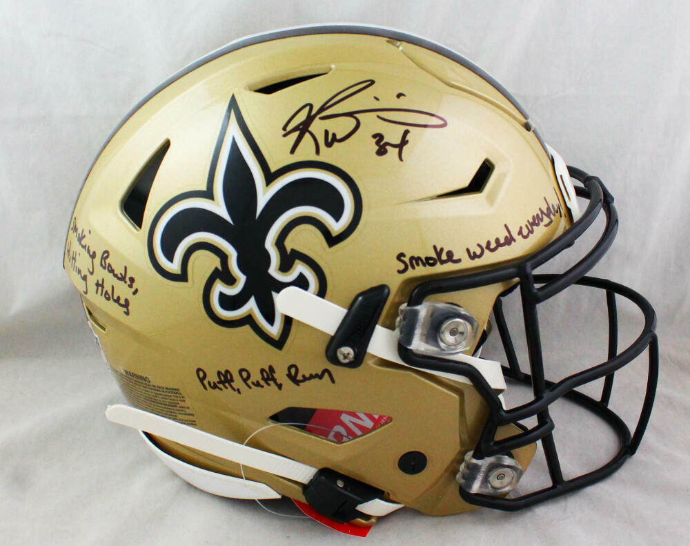 Ricky Williams Autographed New Orleans Saints F/S SpeedFlex Helmet w/Stats - JSA W Auth *Black This is a hand autograph of Ricky Williams of the Miami Dolphins on a Riddell Football Full Size SpeedFlex Helmet. This item is inscribed with Smoke Weed Everyday. This item has a James Spence Witness Protection Authentication, which comes with a numbered sticker and a matching JSA Certificate of Authenticity. You can view this item on the SpenceLOA Authentication website and it shows when and where the item was signed. It was signed either at a public autograph appearance or a private signing. This is a stock photo of the item. Although you may not receive this exact item, the item you receive is virtually identical and brand new in great shape.