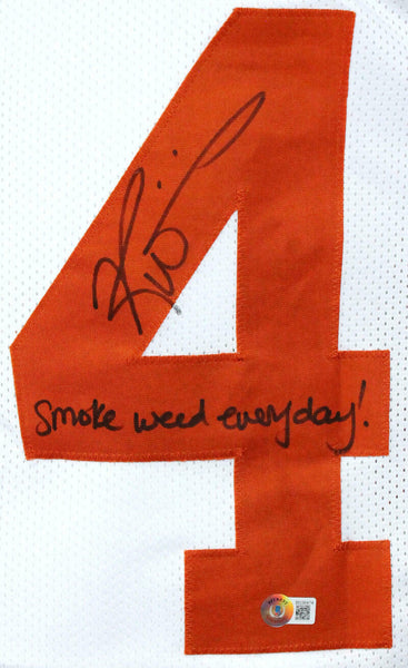 Ricky Williams Autographed White College Style Jersey w/SWED-Beckett Hologram THIS IS NOT AN NCAA JERSEY. THIS HAS NO TAGS, NO LOGOS, NO EMBLEMS. This is a hand autograph of Ricky Williams on a Custom Made (non name brand) Authentic Style Jersey with stitched letters and numbers. Inscribed Smoke Weed Everyday. This item has a Beckett Authentication, which comes with a numbered hologram and a generic Beckett Certificate Of Authenticity. It was signed either at a public autograph appearance or a private signing. This is a stock photo of the item. Although you may not receive this exact item, the item you receive is virtually identical and brand new in great shape. Jersey size is XL.