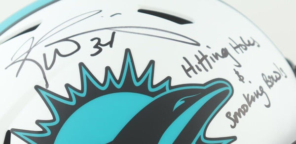 Riddell Miami Dolphins full-size Lunar Eclipse Alternate speed helmet. Hand-signed and inscribed by Ricky Williams. Former NFL running back Ricky Williams is launching his own cannabis lifestyle brand, Highsman - a play on words with the Heisman award he received in 1998, after years advocating for the legalization and normalization of cannabis use.The athlete-focused, purpose-driven brand features cannabis products, apparel and accessories curated by Williams himself. The initial cannabis lineup features three strains: sativa, an indica and a hybrid. The company will also launch its own pre-rolls soon."We are flipping the script on how people view cannabis," Williams said in an exclusive interview.Throughout his professional football career, Williams faced two suspensions for marijuana. And he assures, cannabis helped him deal with the stress and injuries that come with the job - while never hindering his success.The autograph includes an official Beckett Authentication Services serially numbered hologram and QR Code Card for authenticity purposes. The signing of this item was witnessed by Beckett.Authentication: Beckett Hologram & QR Code Card