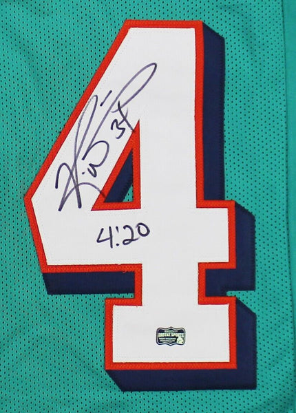 A Miami Custom Teal Jersey hand signed by Ricky Williams. The item and signature are in excellent condition. In addition to signing his name, Ricky also inscribed "4:20" on the item. Ricky is a former American football running back who played 11 seasons in the NFL. Ricky played college football for the University of Texas, where he was a two-time All-American and won the Heisman Trophy. Ricky was drafted by the New Orleans Saints before being traded to the Miami Dolphins. He also spent a season with the Baltimore Ravens. AUTHENTICATION: Your item is tagged with a Ricky Williams Exclusive SmarTag powered by Prova Technology, which gives you digital access to your items authentication records, which include a proof picture from the signing.