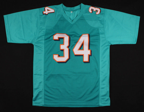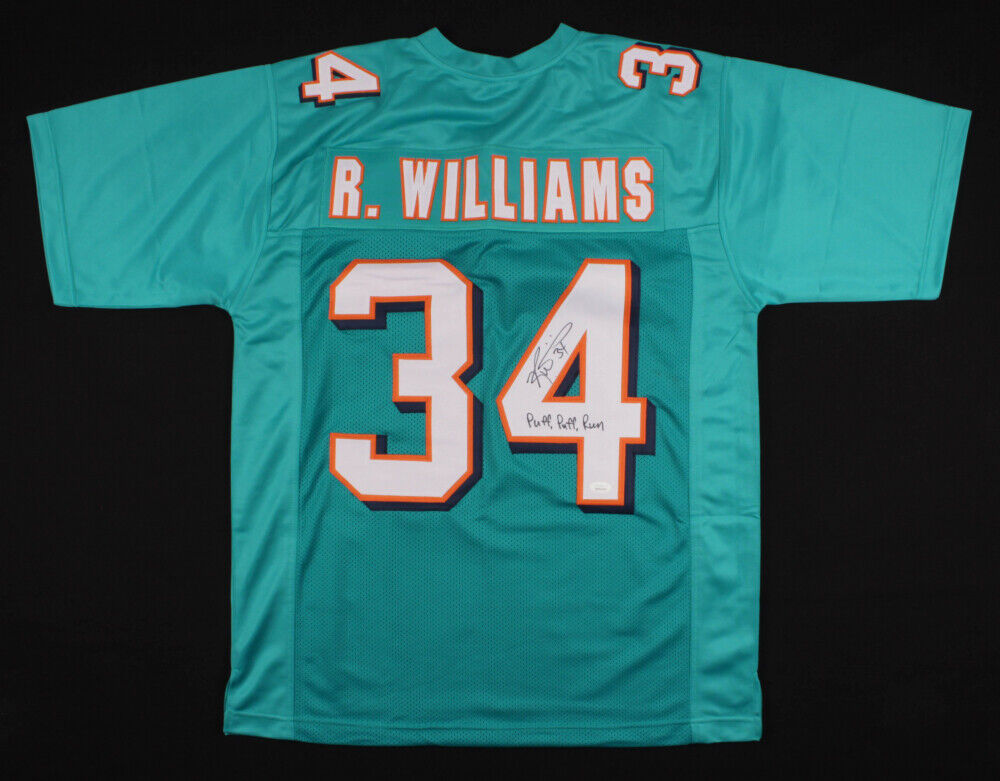 Custom on-field style jersey. Everything is sewn on, size XL. Hand-signed and inscribed in black felt-tip pen by Ricky Williams.Former NFL running back Ricky Williams is launching his own cannabis lifestyle brand, Highsman - a play on words with the Heisman award he received in 1998, after years advocating for the legalization and normalization of cannabis use.The athlete-focused, purpose-driven brand features cannabis products, apparel and accessories curated by Williams himself. The initial cannabis lineup features three strains: sativa, an indica and a hybrid. The company will also launch its own pre-rolls soon."We are flipping the script on how people view cannabis," Williams said in an exclusive interview.Throughout his professional football career, Williams faced two suspensions for marijuana. And he assures, cannabis helped him deal with the stress and injuries that come with the job - while never hindering his success. The lot / autograph(s) includes an official James Spence Authentication (JSA) hologram and matching COA for authenticity purposes. The signing of this item was witnessed by JSA.Authentication: JSA COA