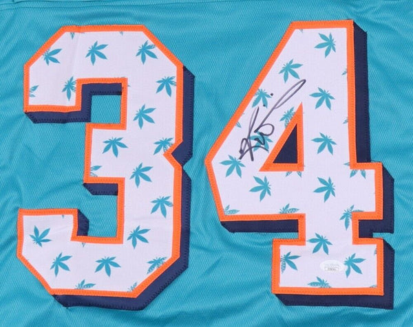 Custom on-field style jersey. Everything is sewn on, size XL. Has been hand-signed by Ricky Williams. Former NFL running back Ricky Williams is launching his own cannabis lifestyle brand, Highsman - a play on words with the Heisman award he received in 1998, after years advocating for the legalization and normalization of cannabis use.The athlete-focused, purpose-driven brand features cannabis products, apparel and accessories curated by Williams himself. The initial cannabis lineup features three strains: sativa, an indica and a hybrid. The company will also launch its own pre-rolls soon."We are flipping the script on how people view cannabis," Williams said in an exclusive interview.Throughout his professional football career, Williams faced two suspensions for marijuana. And he assures, cannabis helped him deal with the stress and injuries that come with the job - while never hindering his success.The lot / autograph(s) includes an official James Spence Authentication (JSA) hologram for authenticity purposes. The signing of this item was witnessed by JSA.Authentication: JSA Hologram