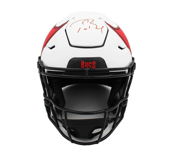 A Tampa Bay Buccaneers Speed Flex Authentic Lunar NFL Helmet hand signed by Tom Brady and Rob Gronkowski. The item and signature are in excellent condition. Tom is a quarterback for the Tampa Bay Buccaneers. He has won a record four Super Bowl MVP awards as well as three NFL MVP awards. Rob is a 5x All-Pro First Team, 5x Pro Bowler, and 2x Super Bowl Champion. AUTHENTICATION: Your item is tagged with a Fanatics Authentic Serial Numbered and Databased Hologram and a Rob Gronkowski exclusive SmarTag powered by Prova Technology, which gives you digital access to your items authentication records, which includes a proof picture from the signing.