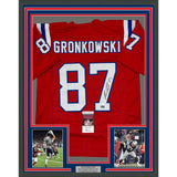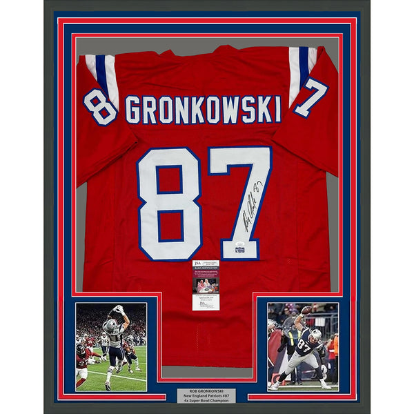 Framed Autographed/Signed Rob Gronk Gronkowski 35x39 NE Red Jersey JSA COA The item is professionally framed and matted with two 5x7 photos, measures 35x39 inches and is ready to be hung in your man cave! Photo and matting requests can be made.