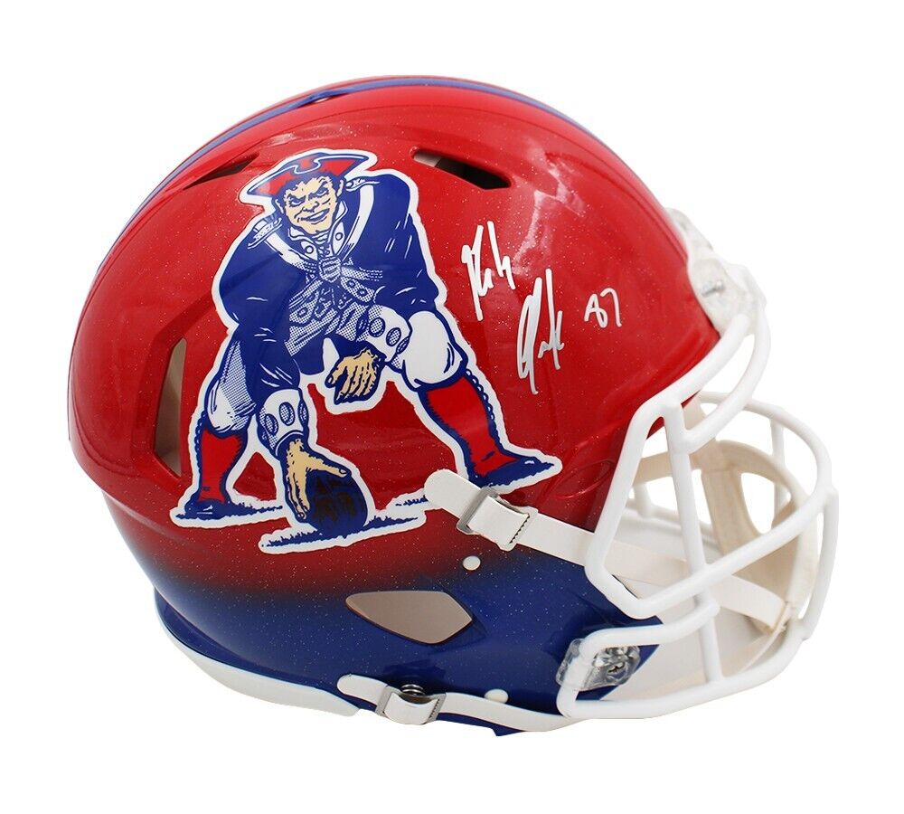A New England Patriots Speed Authentic Throwback Custom Red/Blue Fade NFL Helmet hand signed by Rob Gronkowski. The item and signature are in excellent condition. Rob is a 5x All-Pro First Team, 5x Pro Bowler, and 2x Super Bowl Champion. AUTHENTICATION: The item is accompanied by a Certificate of Authenticity - Rob Gronkowski Exclusive Serial Numbered & Databased Hologram - Picture of Rob from the signing