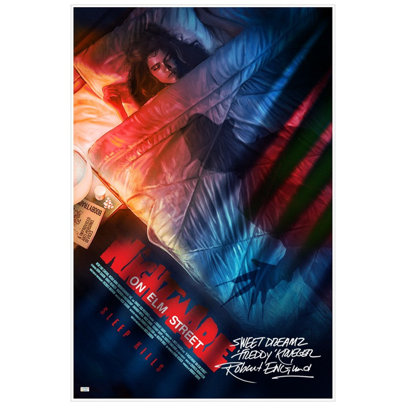 From artist Rich Davies's hand-numbered edition is this vibrant A Nightmare on Elm Street Giclee available in a very limited number and personally hand-signed by Freddy himself, Robert Englund during his autograph signing with Celebrity Authentics. Giclee print measures 23" x 36" with Robert adding a fantastic "Sweet Dreams - Freddy Krueger" inscription! Robert shared this stunning piece was one of his all-time favorite art prints that he had ever seen. In Wes Craven's classic slasher film, several Midwestern teenagers fall prey to Freddy Krueger (Robert Englund), a disfigured midnight mangler who preys on the teenagers in their dreams -- which, in turn, kills them in reality. After investigating the phenomenon, Nancy (Heather Langenkamp) begins to suspect that a dark secret kept by her and her friends' parents may be the key to unraveling the mystery, but can Nancy and her boyfriend Glen (Johnny Depp) solve the puzzle before it's too late? Ships affixed with Celebrity Authentics serial-numbered and tamper evident Authentication Hologram and includes Celebrity Authentics Certificate of Authenticity featuring picture of Robert signing the print. Stock image used for product images. Ships with clean, unsmudged autograph in similar location. Please note: with multiples signed by the actor, a sample photo is used from stock to represent what you will receive. Exact autograph size and placement may vary.