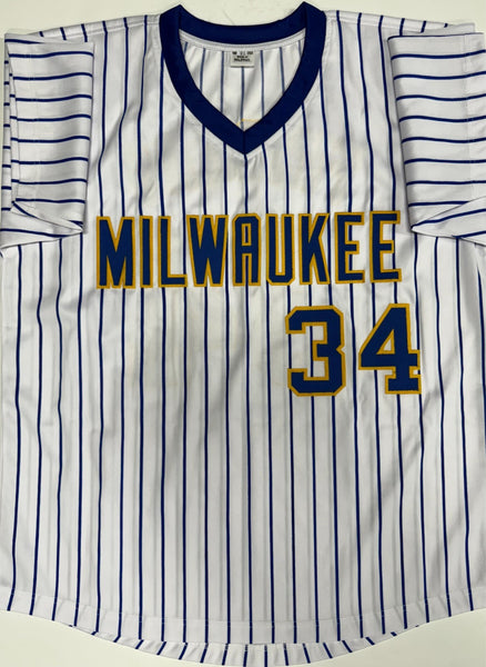 custom replica jersey of Milwaukee Brewers Hall of Famer ROLLIE FINGERS. This jersey is signed with Silver paint pen and includes the inscription "HOF '92". This jersey is size XL has all letters and numbers sewn in. This item was signed at a private signing with us and would make a great addition to any Brewers collection. This item is guaranteed to be 100% authentic and will include a COA from Beckett Authentication with matching serial numbers.
