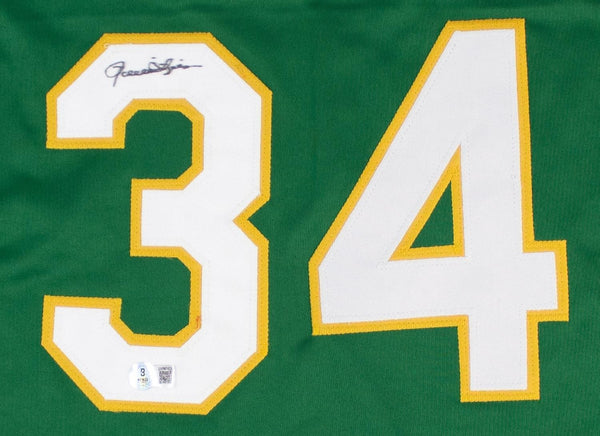 Custom on-field style jersey. Everything sewn on, size XL. Hand-signed in silver paint pen by Rollie Fingers (HOF).This autograph is certified by Beckett Authentication Services (BAS) Witness Certification. That means that a Beckett representative was present when this item was signed. It comes with the numbered authentication scannable hologram with a QR code that verifies the authentication on the Beckett website.