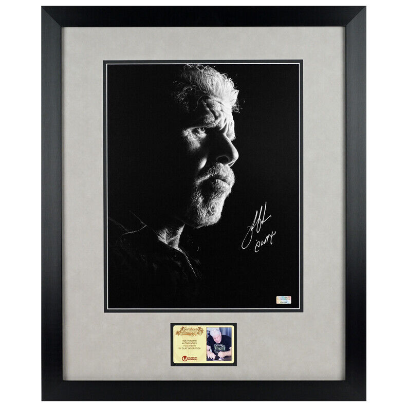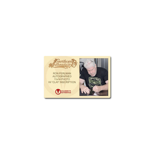 This 11x14 photo of Clay Morrow from Sons of Anarchy has been personally hand-signed by Ron Perlman during his signing with Celebrity Authentics. Sons of Anarchy are a motorcycle club operating both illegal and legal businesses in the small town of Charming, Clay likes it old school and violent, while Jax wants to change the way things are being done in this crime drama series. Item ships affixed with Celebrity Authentics serial-numbered and tamper evident Authentication Hologram and includes Celebrity Authentics Certificate of Authenticity featuring picture of Ron signing photo.Framing: Photo is meticulously dry mounted and framed using acid free backing and mat boards with white core for the finest in presentation. UV protective glass with precision cut moulding are used for smooth, clean frame edges, hand assembled in our studio. Additionally, a protective back cover is used to seal the piece with corner bumpers applied to protect your walls, providing adequate air flow. A hanger is affixed to complete the finished collectible. Each framed photo is carefully wrapped for shipping with double protective corners and cushioning to help ensure the item's safe arrival. Celebrity Authentics Framing Studios - acclaimed as the industry's finest!Please note: with multiples signed by the actor, a sample photo is used from stock to represent what you will receive. Exact autograph size and placement may vary.