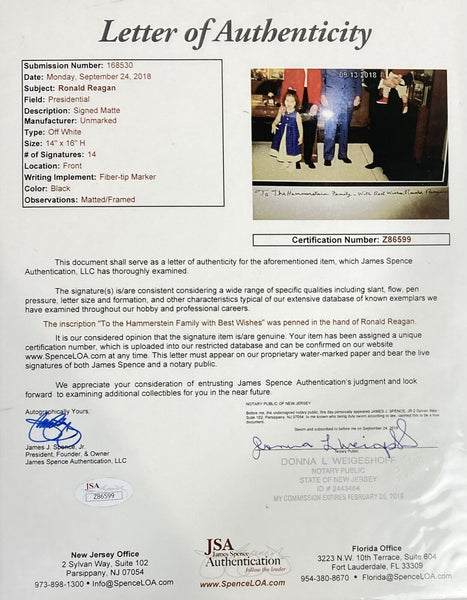 Featured is a Ronald Reagan signed photo matte. This matte has been hand signed by Reagan and comes with the JSA hologram and letter of authenticity. This matte has been professionally framed and is approximately 16x20.. SPECIFICATIONS Autographed By: Team: Sport: Baseball Authentication: James Spence Authentication (JSA)