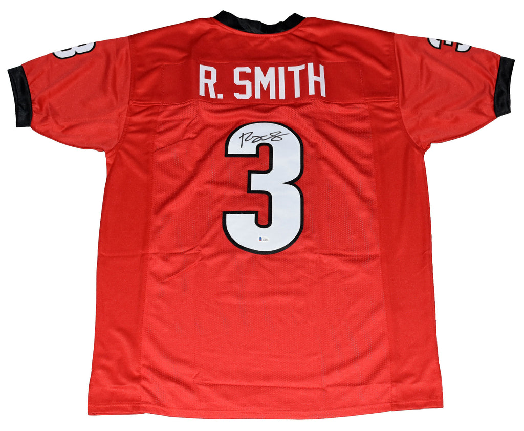 Roquan Smith, former All-American linebacker for the Georgia Bulldogs, has hand signed this red custom jersey at a private signing. Jersey is size XL and all letters/numbers are sewn-on. This item comes with a certificate of authenticity (COA) from Beckett Authentication Services and was signed in the presence of one of their representatives. You will receive a serial-numbered COA along with a matching serial-numbered sticker on the jersey. The authenticity can be verified online by entering the serial number.Item pictured may not be the exact item you will receive. It will be similar quality, and we guarantee your satisfaction.