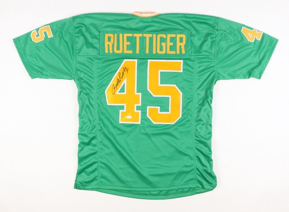 Custom on-field style jersey. Everything is sewn on, size XL. Hand-signed by Rudy Ruettiger.The lot / autograph(s) includes an official James Spence Authentication (JSA) hologram and matching COA for authenticity purposes. The signing of this item was witnessed by JSA.Authentication: JSA COA