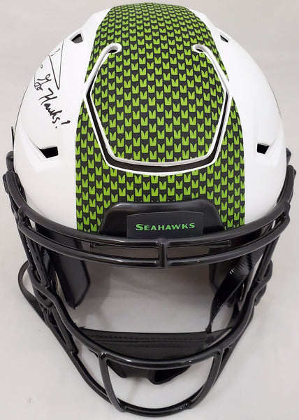 This is a Seattle Seahawks Full Size White Lunar Eclipse Authentic Hyper Speed Flex Helmet that has been hand signed by Russell Wilson. This item has the official tamper-proof Russell Wilson serial numbered hologram and matching certificate of authenticity. A It has also been authenticated with the Beckett Witness certification, meaning both a representative from Beckett and Mill Creek Sports witnessed the signing. A It also comes with their sticker and matching certificate of authenticity. A NOTE: The Eclipse helmets are very delicate and often have some marks or scratches on them.