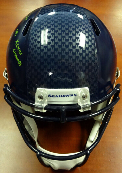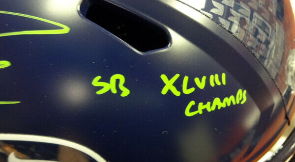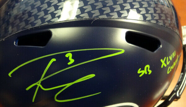 This is a Seattle Seahawks Full Size Replica Speed Helmet that has been hand signed by Russell Wilson. Along with the autograph, this item also comes with the inscription which reads "SB XLVIII Champs". This one is signed in green. This item has the official tamper-proof Russell Wilson serial numbered hologram and matching certificate of authenticity.