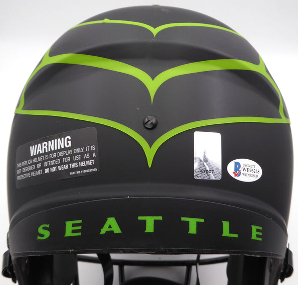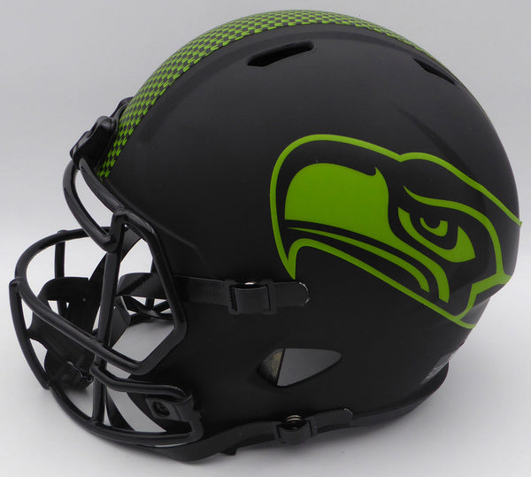This is an Eclipse Black Full Size Replica Helmet that has been hand signed by Russell Wilson. There are marks on the item as shown. This item has been certified authentic by Beckett Authentication (BAS) and comes with their tamper-proof sticker. Beckett Authentication has recently changed their physical certificate card policy where they no longer match their tamper-proof sticker with a physical certificate. If the item features a Beckett Authenticated QR Code, the item does NOT come with a matching certificate. The tamper-proof sticker holds the value in the authentication process while the certificate does not. A certificate can be printed on Beckett's website for the matching authentication number.