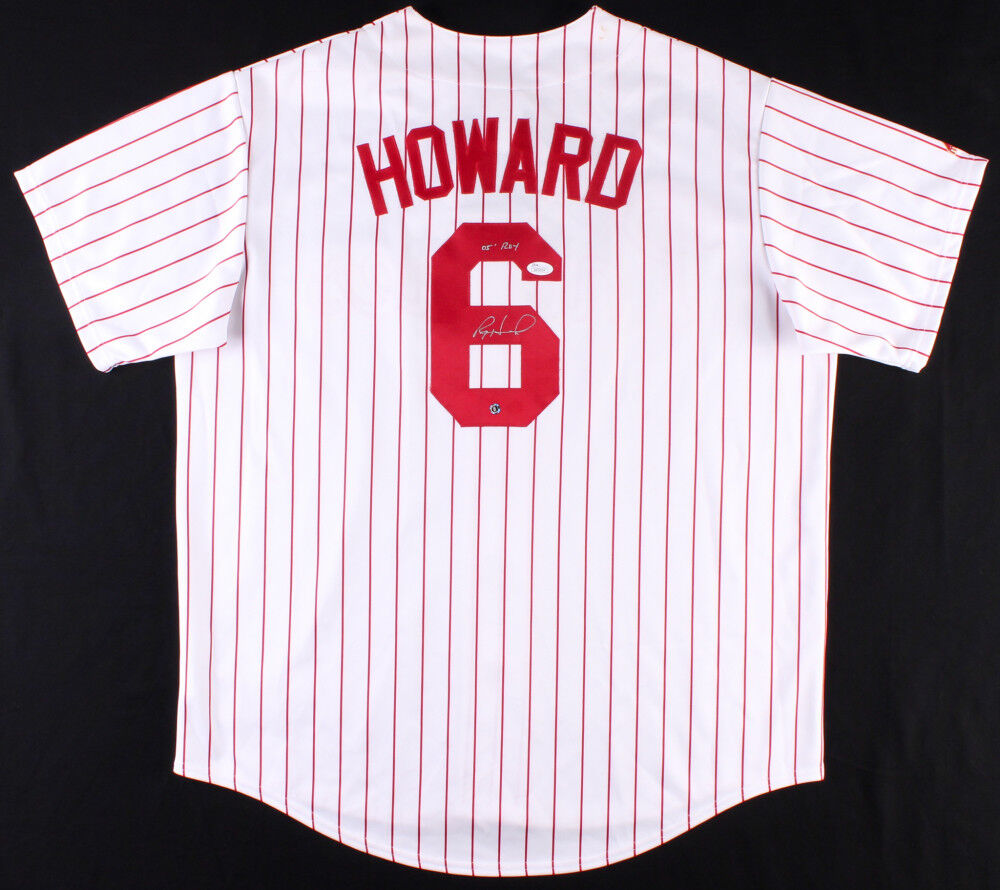 Custom on-field style jersey. Everything sewn on, size XL. Hand-signed in silver paint pen Ryan Howard. The lot / autograph(s) includes an official James Spence Authentication (JSA) hologram and matching COA for authenticity purposes.Authentication: JSA COA