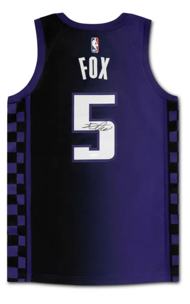 Born in New Orleans, Louisiana, De'Aaron Fox attended Cypress Lakes High School in Katy, Texas. Known for his quickness, speed, and athleticism, Fox was rated as a five-star recruit and ranked the consensus Number 6 overall recruit in the Class of 2016 by Rivals, ESPN, and 247Sports. After attending one year at the University of Kentucky Fox would enter the 2017 NBA Draft where he was drafted 5th overall by the Sacramento Kings. Fox's quickness makes him one of the most dangerous players on the fast break, his nearly 6-foot 7-inch wingspan also gives him the ability to finish layups at the rim and makes him an elite defender. Fox was the 2023-2024 NBA steals leader averaging 2 steals per game.This Sacramento Kings purple Jordan Brand swingman Statement Edition jersey is autographed by De'Aaron Fox. Fox's signature was witnessed by an Upper Deck representative as part of UDA's 5-step authentication process.Personally Autographed by De'Aaron FoxIf for any reason you are not completely satisfied with the quality or authenticity of your purchase, we will gladly give you a full refund or exchange, whichever you prefer up to 30 days after purchase.Please feel free to e-mail us with any questions.Thank you.Authenticator Pre-CertifiedAuthenticator: Upper Deck AuthenticatedHistory of item: De'Aaron Fox signed this item in the presence of a representative from Upper Deck Authenticated.Describe how you came to possess this item: Super Sports Center is a fully authorized dealer for Upper Deck Authenticated as well as Mounted Memories and Steiner Sports.Other information about you and / or the item: Super Sports Center strives to deliver the most authentic in sports memorabilia from trusted companies like Mounted Memories, Steiner Sports and Upper Deck Authenticated. If it exists, we can find it for you