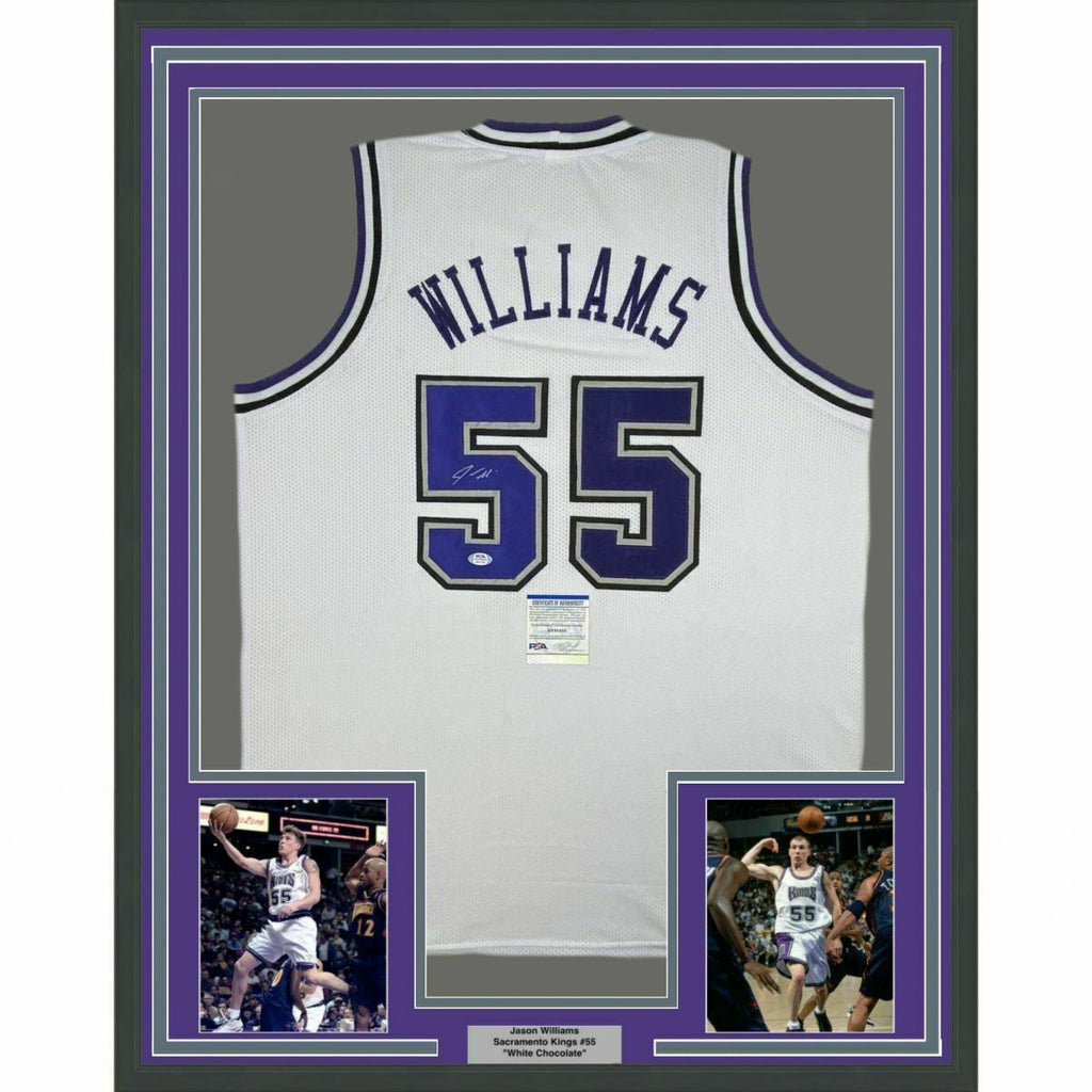FRAMED Autographed/Signed JASON WILLIAMS 33x42 Sacramento White Jersey PSA COA The item is professionally framed & matted with two 8x10 photos, measures 33"x42" and is ready to be hung in your man cave! NOTE: COA card will be mounted on the back of the frame, not inside it on top of the jersey as seen in the picture.