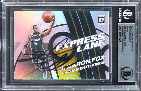 This Autographed 2021 Donruss Optic Express Lane Holo #10 Card has been Personally Signed by De'Aaron Fox of the Sacramento Kings. This item is 100% Authentic, it comes slabbed and authenticated by Beckett Authentication Services. The authenticity can be verified on Beckett Authentication Services website.