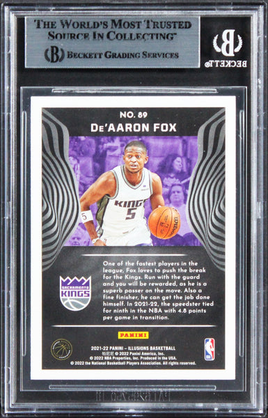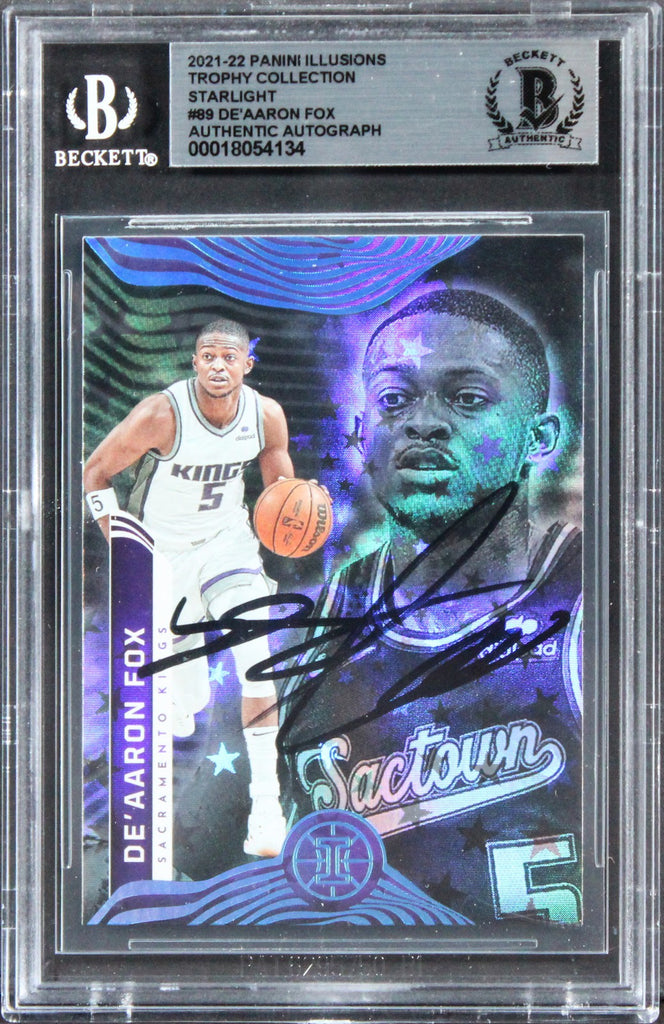 This Autographed 2021 Panini Illusions Trophy Collection Starlight #89 Card has been Personally Signed by De'Aaron Fox of the Sacramento Kings. This item is 100% Authentic, it comes slabbed and authenticated by Beckett Authentication Services. The authenticity can be verified on Beckett Authentication Services website.