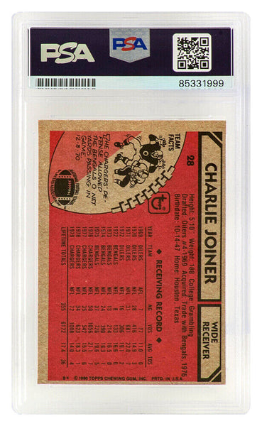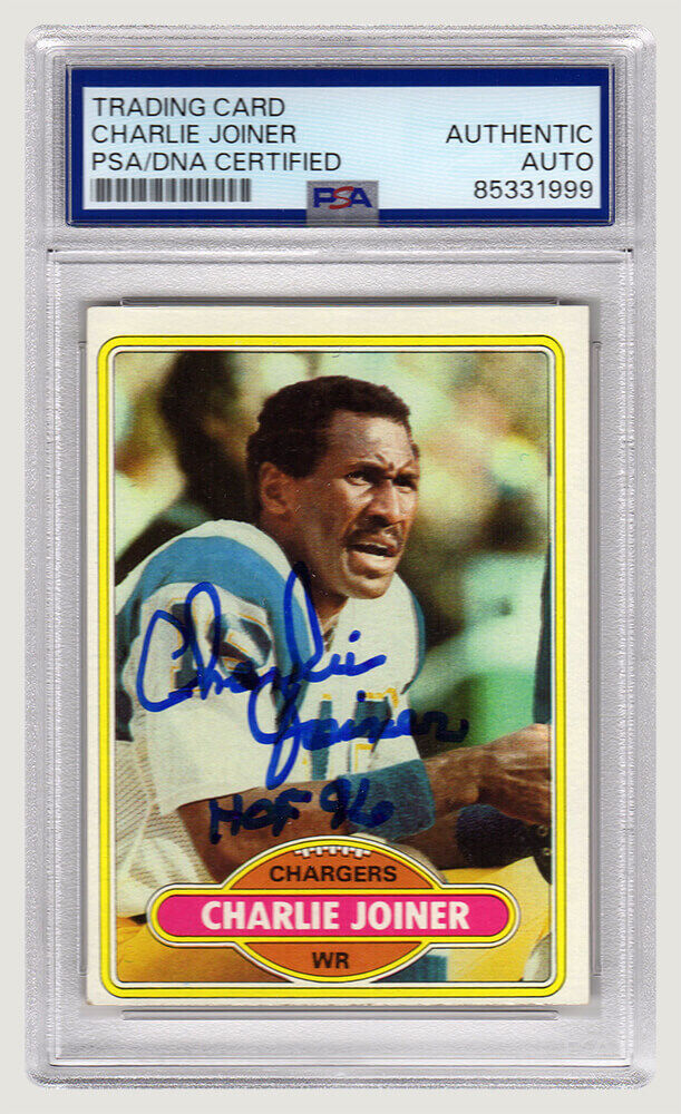 Charlie Joiner signed San Diego Chargers 1980 Topps football trading card #28 with 'HOF 96' inscription. The card has been authenticated and encapsulated by PSA/DNA and the number can be verified online.