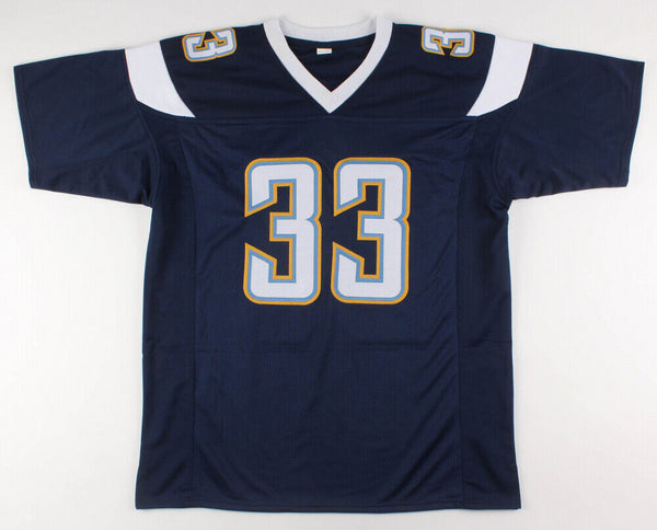 Custom on-field style jersey. Everything is sewn on, size XL. Hand-signed in black felt-tip pen by Derwin James. The lot / autograph(s) includes a PSA/DNA "Rookie Graph" hologram and COA. "Rookie Graph" is the autographed memorabilia equivalent to a rookie card. The PSA/DNA definition of a "Rookie Graph" is as follows: "Any item that is autographed and received by PSA/DNA prior to the beginning of the athlete's second full season.Authentication: PSA COA