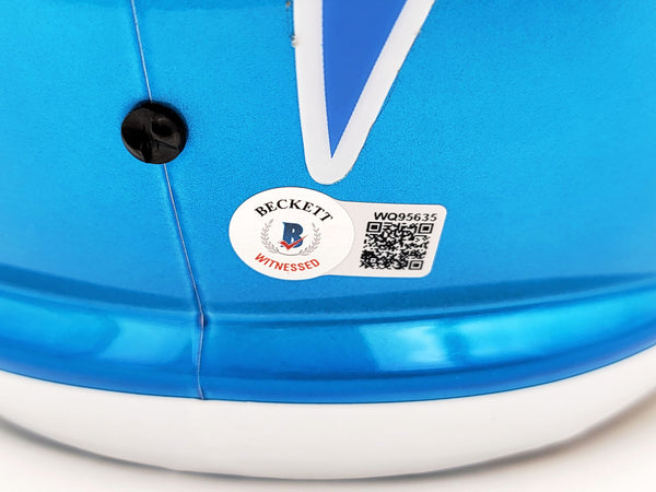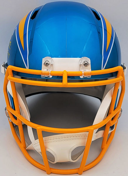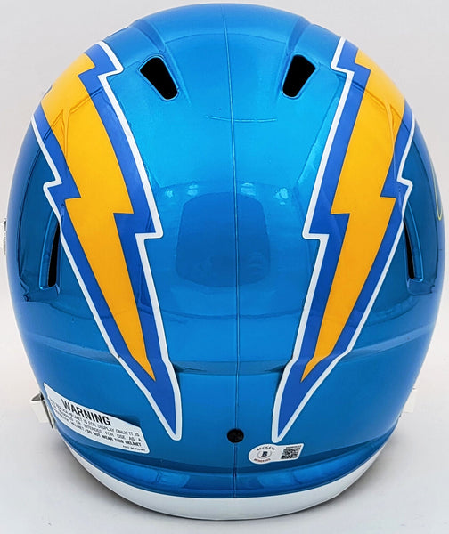 This is a San Diego Chargers Flash Blue Full Size Replica Speed Helmet that has been hand signed by LaDainian Tomlinson. The Flash helmets are delicate and often have some marks or scratches on them. This item was inscribed "HOF 17." This item has been certified authentic by Beckett Authentication (BAS) and comes with their tamper-proof QR Code sticker that can be verified on the Beckett-authentication.com.