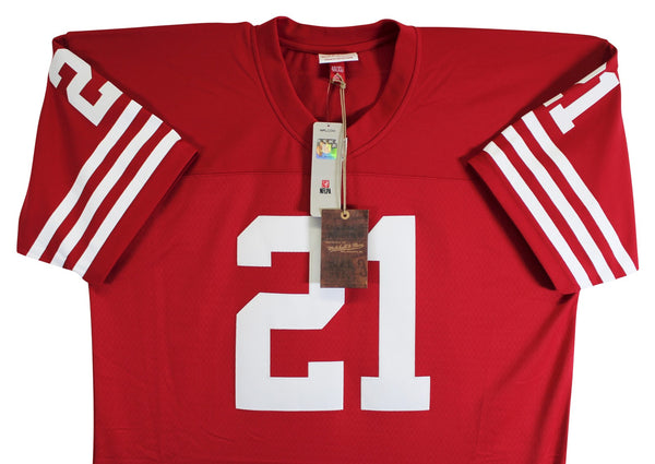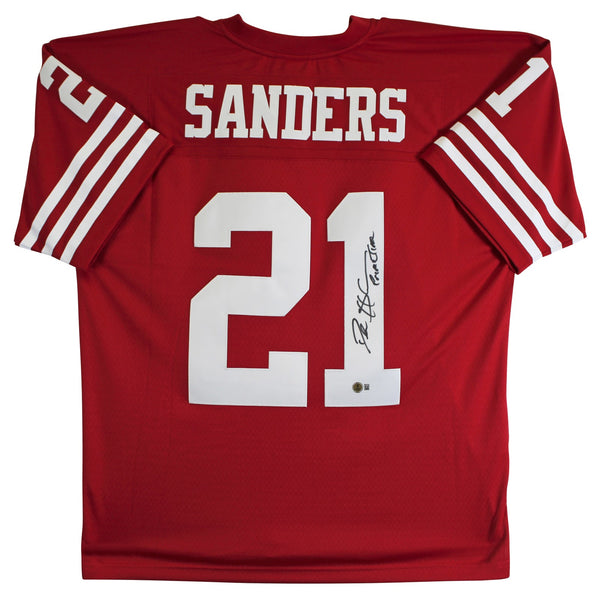 This Autographed Red Mitchell & Ness Throwback Jersey with the inscription of "Primetime" has been Personally Signed by Deion Sanders of the San Francisco 49ers. This item is 100% Authentic to include a hologram by Beckett Authentication Services. This item will come with an affixed Beckett Authentication Services (BAS) authentication sticker, which includes a scannable QR code to verify authenticity. Please note that Beckett no longer provides serial-numbered COA cards, and the attached BAS sticker will serve as the complete authentication for this item. This is a BAS Witnessed Protection Program item which means a Beckett Authentication Service representative was present when this item was being signed. We conducted an autograph signing with Deion Sanders where multiples of the same item were signed. While the photographs are representative of this item, the size, placement and strength of the signature may vary. Each item is hand signed, therefore, each autograph is unique. This item can be verified through BAS Witnessed. This is a X-Large sized Jersey.