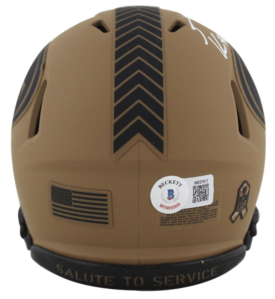 This Autographed Alternate 2023 Salute To Service II Speed Mini Helmet W/ Uv Mirrored Back Acrylic Display Case has been Personally Signed by George Kittle of the San Francisco 49ers. This item is 100% Authentic to include a hologram by Beckett Authentication Services. This item will come with an affixed Beckett Authentication Services (BAS) authentication sticker, which includes a scannable QR code to verify authenticity. Please note that Beckett no longer provides serial-numbered COA cards, and the attached BAS sticker will serve as the complete authentication for this item. This is a BAS Witnessed Protection Program item which means a Beckett Authentication Service representative was present when this item was being signed. We conducted an autograph signing with George Kittle where multiples of the same item were signed. While the photographs are representative of this item, the size, placement and strength of the signature may vary. Each item is hand signed, therefore, each autograph is unique. This item can be verified through BAS Witnessed.