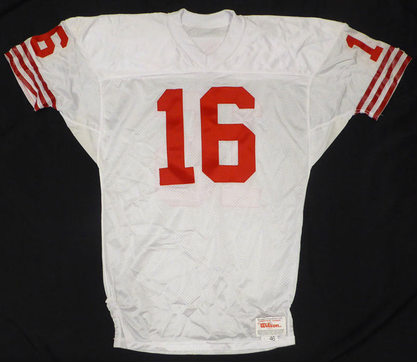 This is a White Wilson Authentic Game Model San Francisco 49ers Jersey that has been hand signed by Joe Montana. NOTE: The jersey was framed, and has some tape on it. It still displays nice. This item has been certified authentic by Beckett Authentication (BAS) and comes with their tamper-proof QR Code sticker that can be verified on the Beckett-authentication.com.