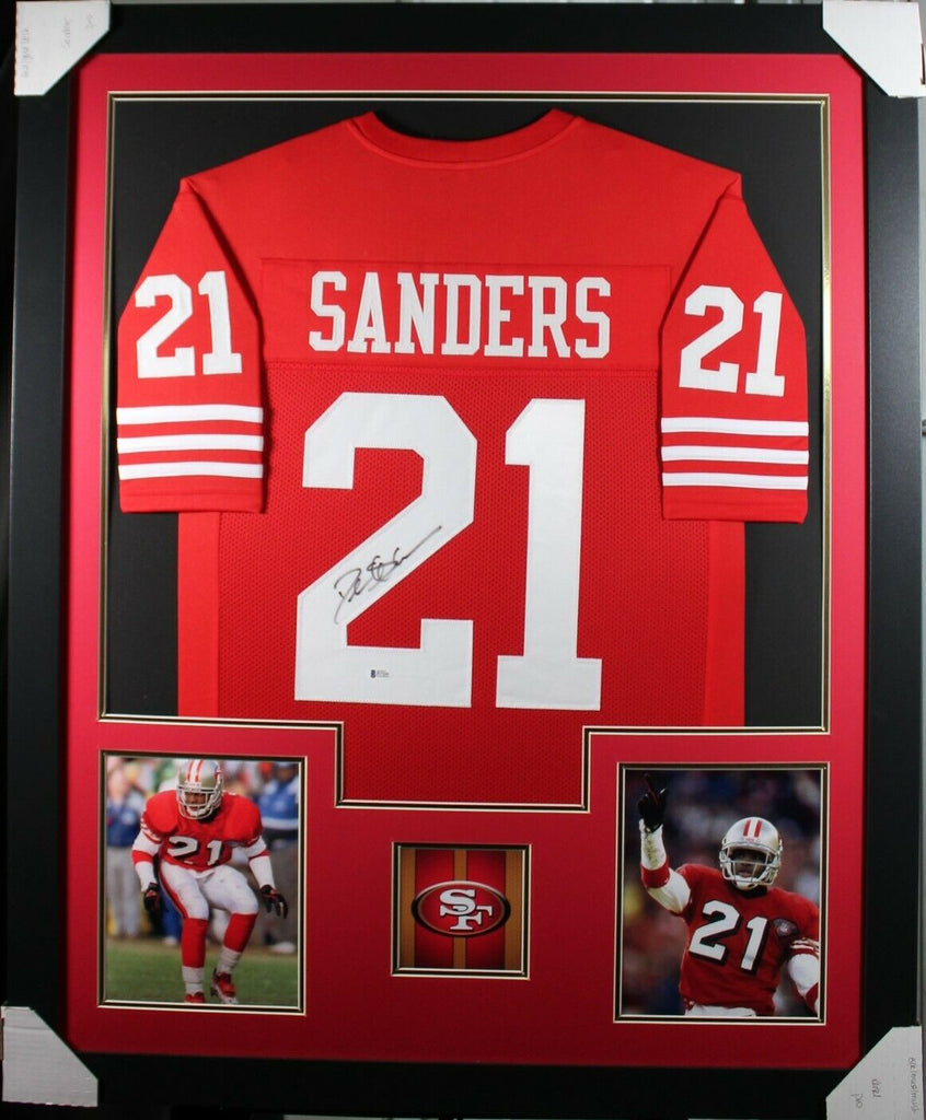 DEION SANDERS AUTOGRAPHED & PROFESSIONALLY FRAMED PRO-STYLE JERSEY(Occasionally our own stock pictures are used at times due to quantity of framing, all frames will look identical as the one pictured)Item is accompanied with a Certificate of Authenticity issued by PSA and corresponding tamper proof hologram on the jersey.THE FRAMED JERSEY MEASURES 35"x 44" & COMES WITH THE FOLLOWING:-UV Protected Acrylic-Triple Acid Free Team Colored Matting-2 High Quality 8"x10" Photos-Team Logo